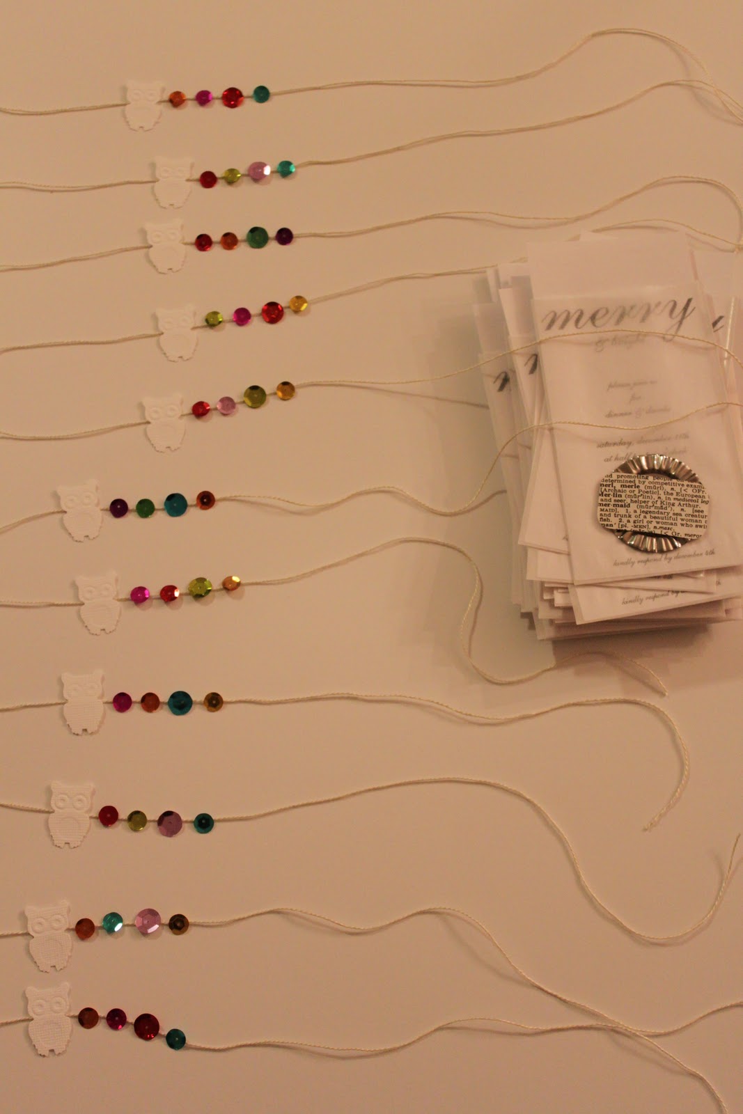 Owls and sequins dried overnight. I picked out sequins that I thought looked like the colors of anodized tin. Needed to add some kind of vintage flair.