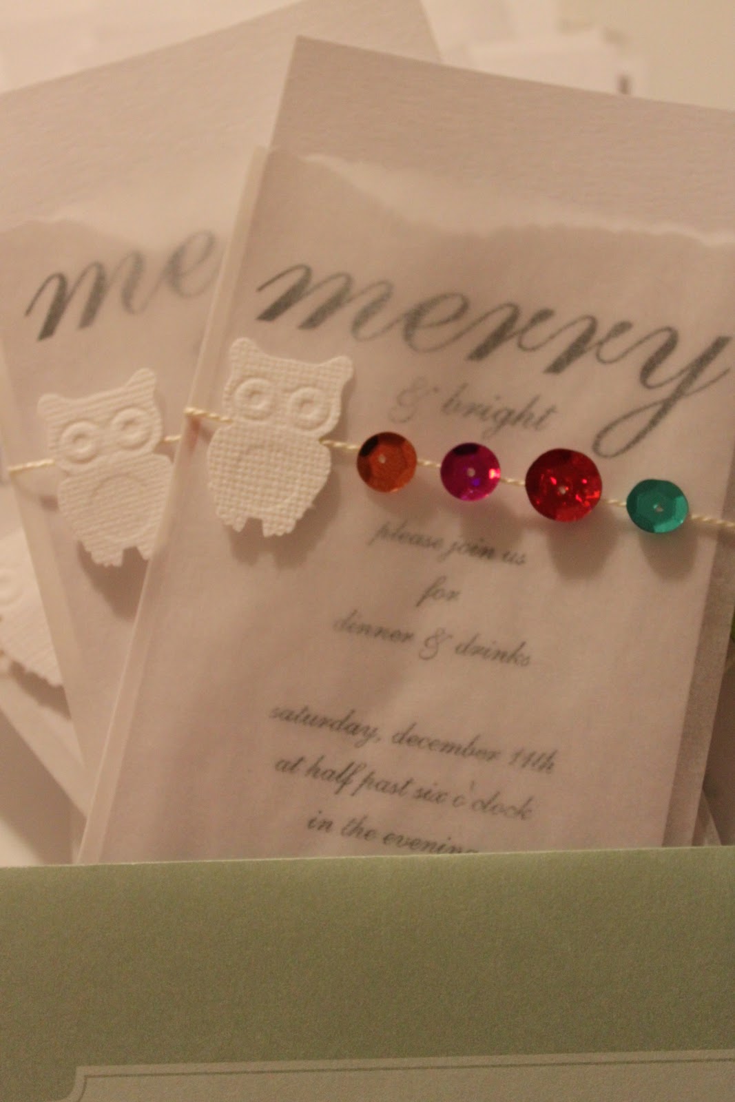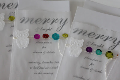 Oh - you can see the owls better here. I punched them out using Bazill paper. Just one more tip - when you go to mail any invite or card that might stick out a bit or be delicate take them to the post office and ask them to hand cancel the stamp. It is no extra charge and then your invite won't have to go through the machinery and maybe get smushed or damaged.