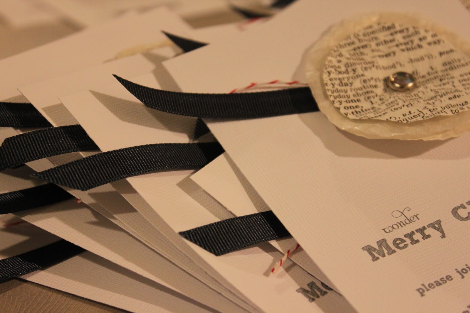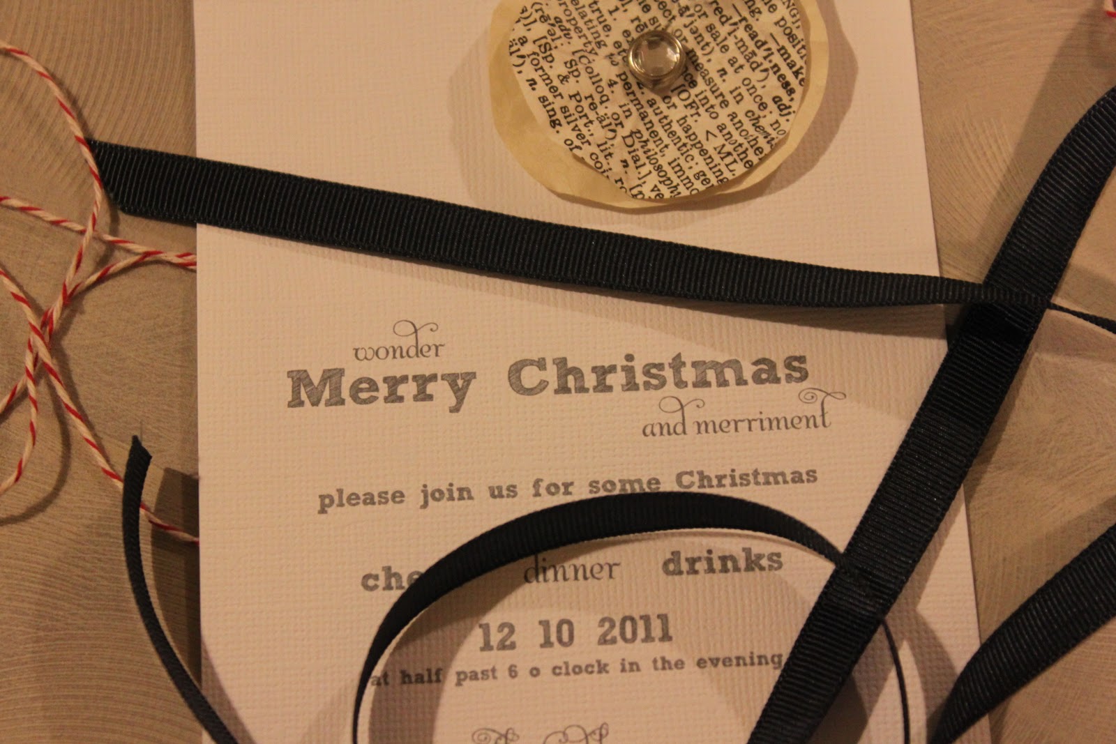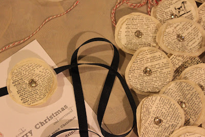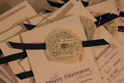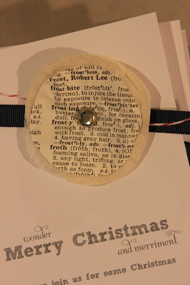 I have really loved using old book pages in projects this year. I like them so much I used them to create our Christmas invitations.