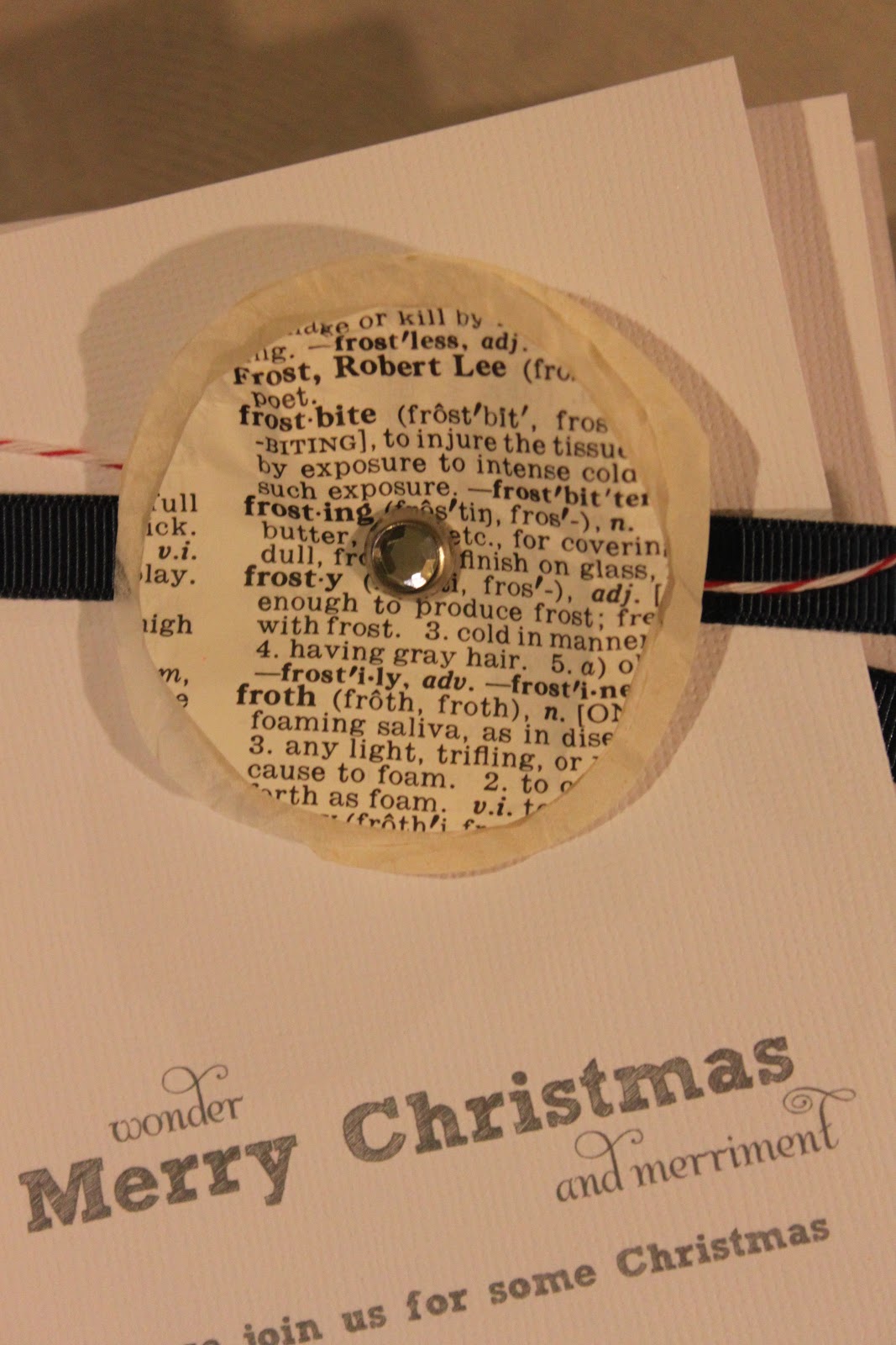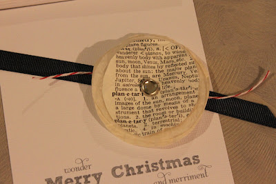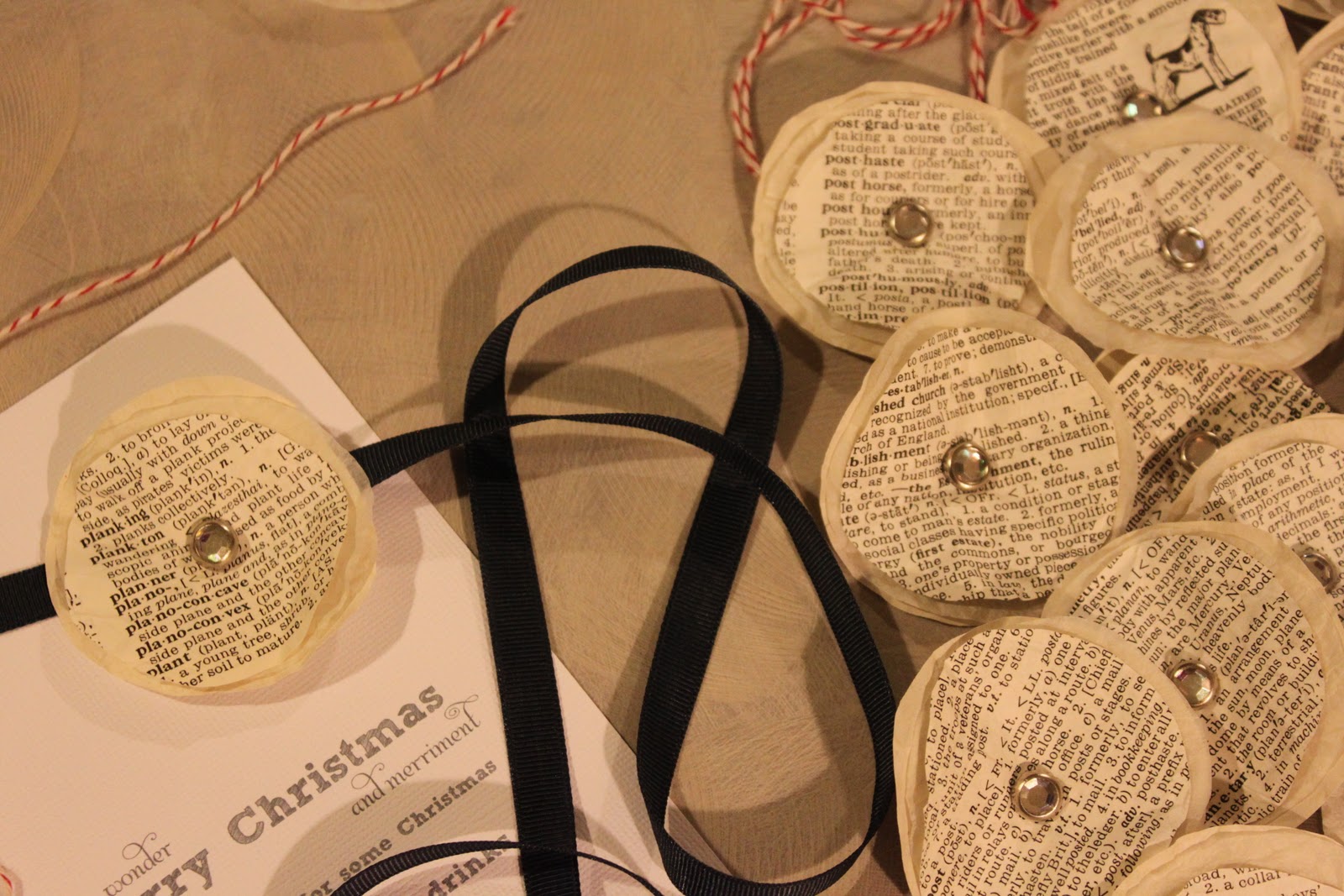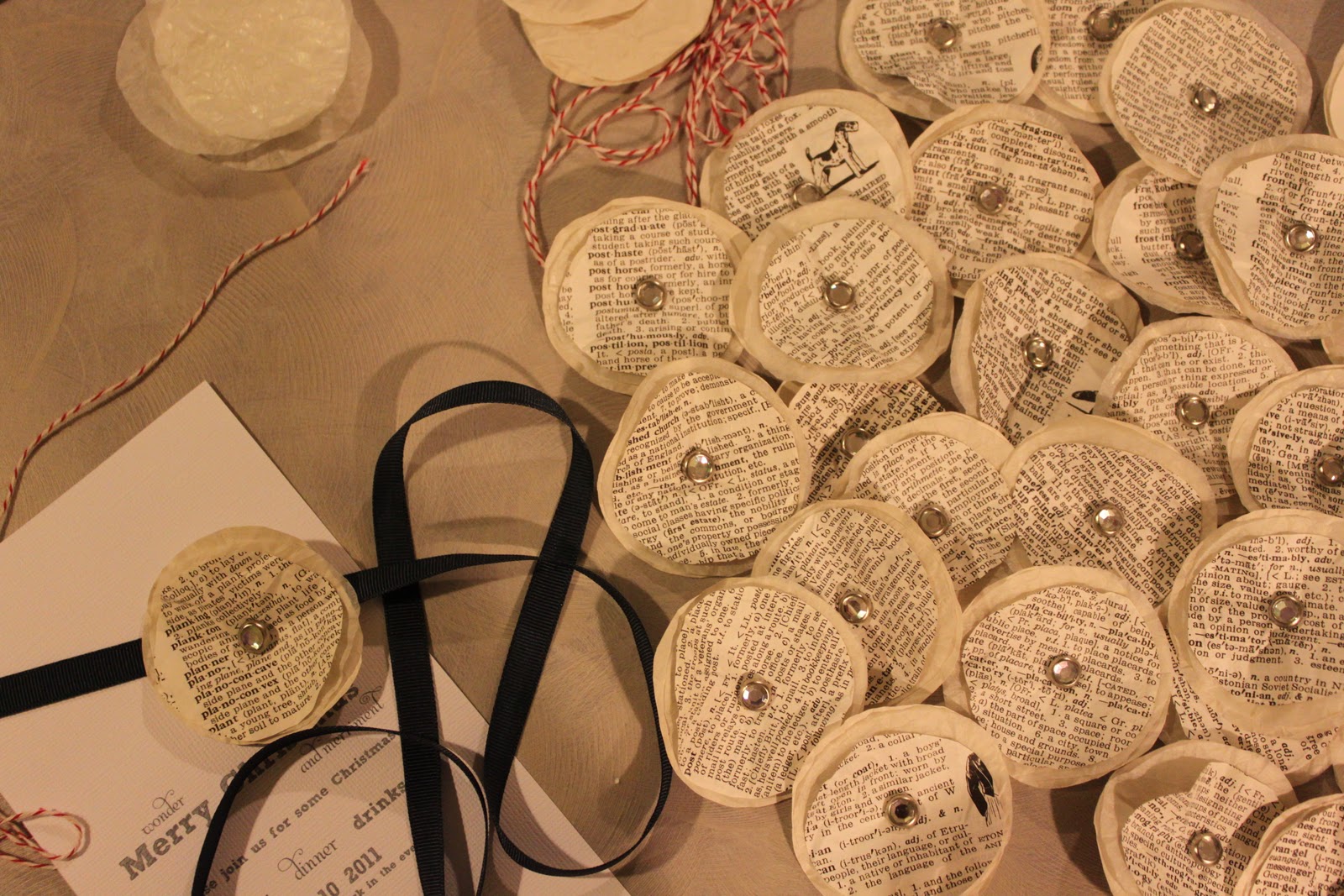 I have really loved using old book pages in projects this year. I like them so much I used them to create our Christmas invitations.