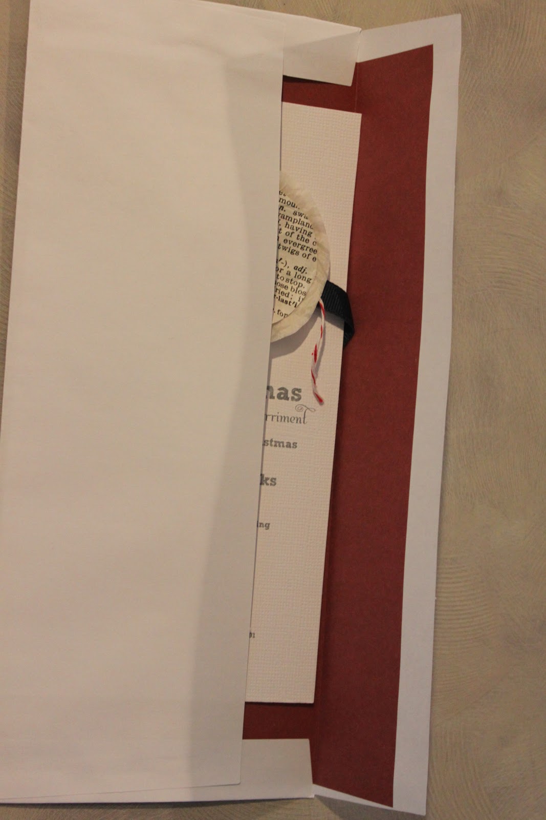 The invite still needed a little something more. The red and white striped bakers twine was in my ribbon box - and since it reminded me of candy canes, hot cocoa, and Christmas why not use it as the perfect addition.