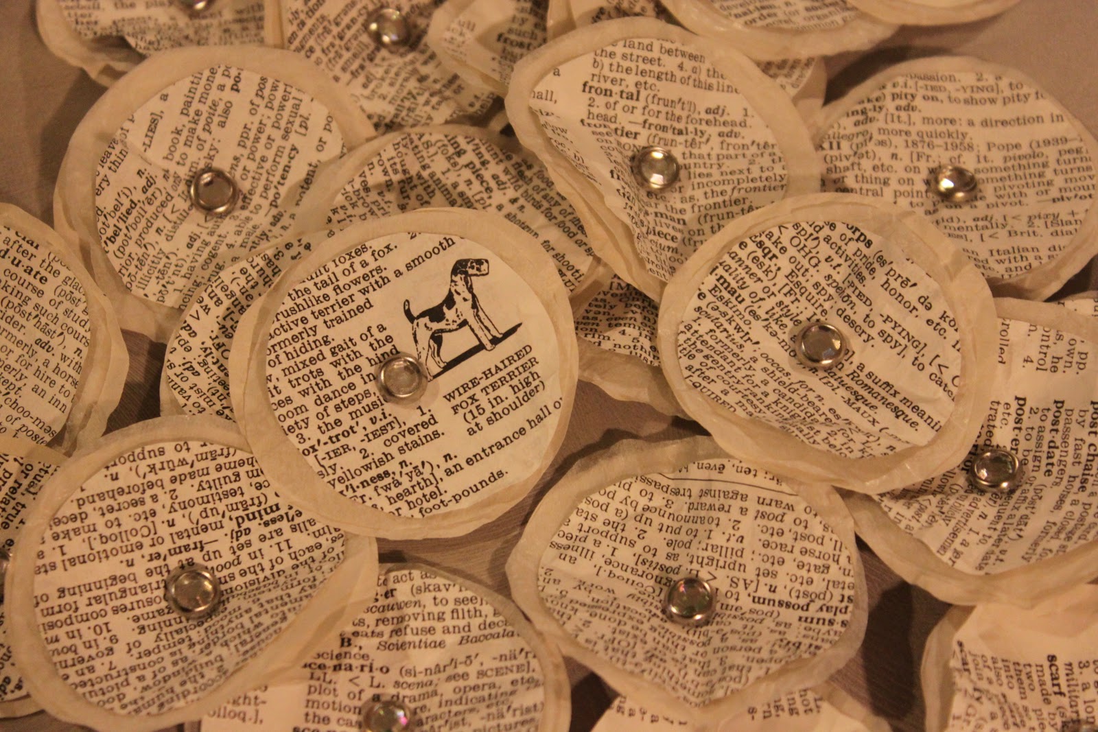 I started by cutting out a bunch of circles using book pages, paper, and tissue. Then just layered them up, and secured each of them with a brad.
